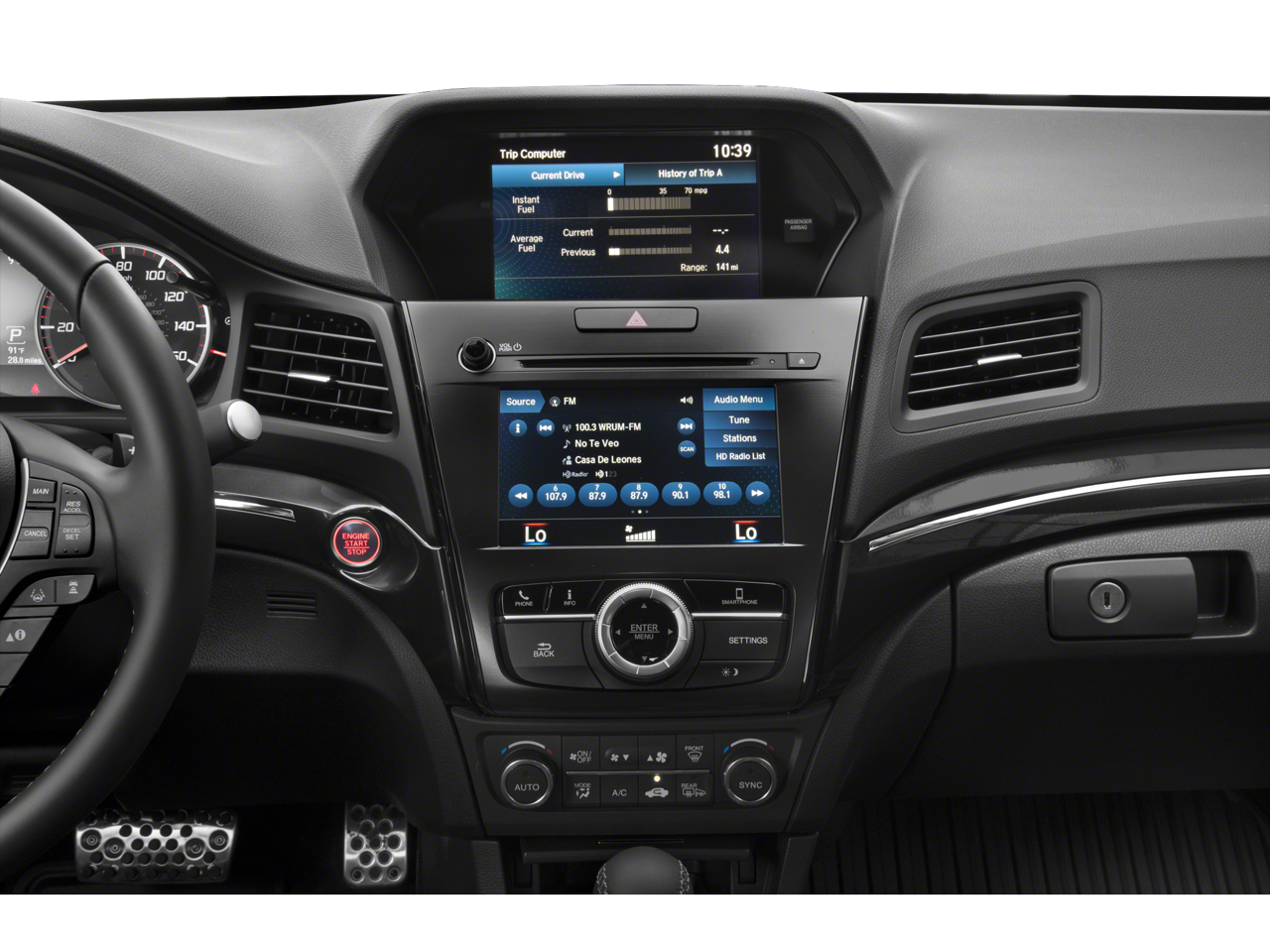- Radio: Acura/ELS Studio Premium Audio System -inc: 10 speakers, MP3/auxiliary input jack, Speed-Sensitive Volume Compensation (SVC), USB audio interface, Bluetooth® streaming audio, SiriusXM satellite radio, HD Radio, Song By Voice, Pandora compatibility, Acura navigation system w/3D view, AcuraLink Real-Time Traffic w/street and freeway conditions, traffic rerouting, AcuraLink Connected Services, Bluetooth® HandsFreeLink wireless telephone interface, color multi-information display w/turn-by-turn guidance, On Demand Multi-Use Display (ODMD), Siri Eyes Free, Apple CarPlay integration and Android Auto integration