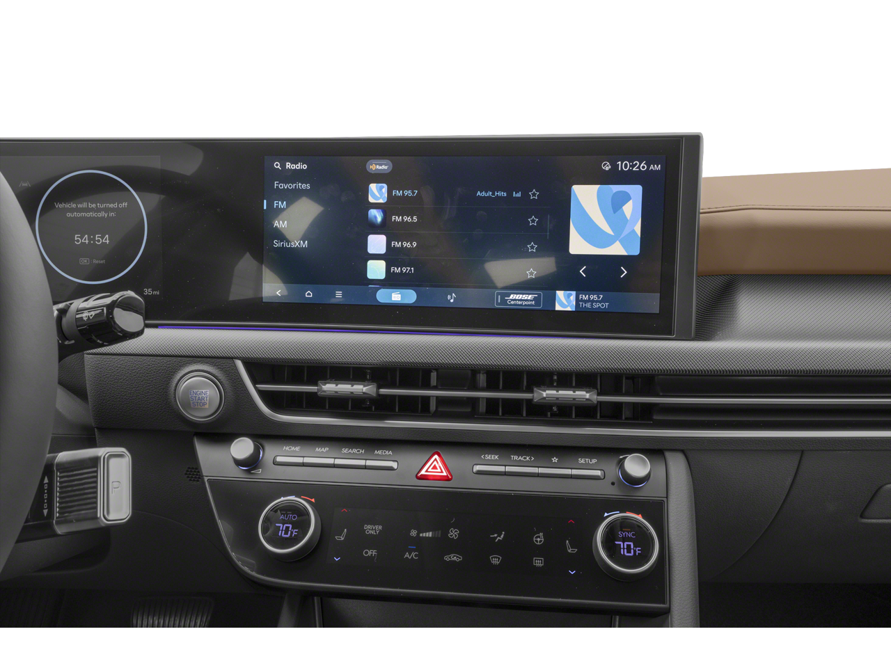 - Radio: AM/FM/HD/SiriusXM -inc: 12.3" high-resolution touchscreen, Bose premium audio w/12 speakers (1 center channel, 2 dash, 2 front tweeters, 4 door mounted, 2 rear mounted speakers plus 1 rear mounted subwoofer), dynamic voice recognition, smartphone integration, Bluetooth®, Over-The-Air updates, USB connectivity, Blue Link+ connected car, Android Auto/Apple CarPlay capability (wireless and wired), HERE HD traffic and diversity antenna (navigation and premium audio)